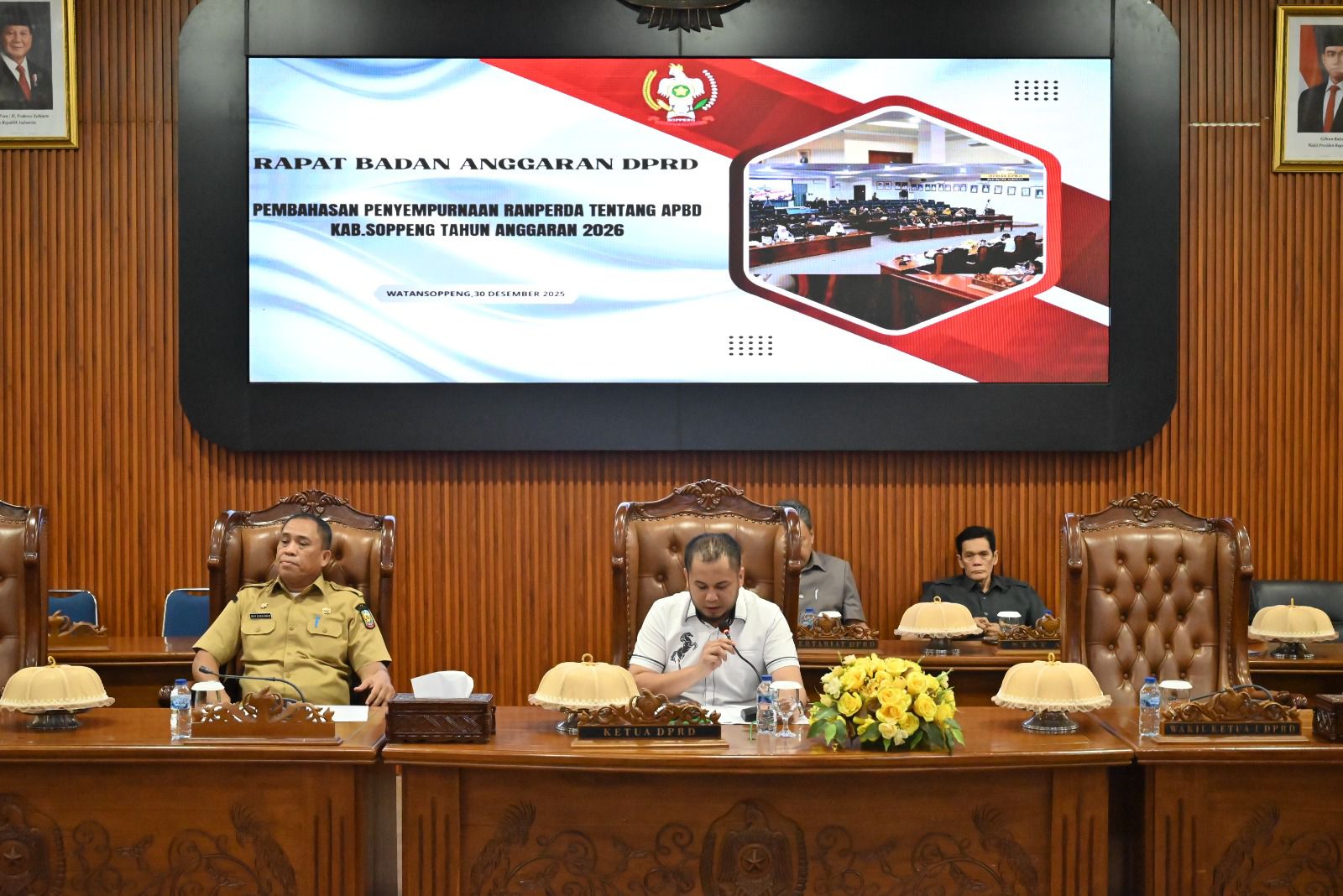 DPRD Kabupaten Soppeng melalui Badan Anggaran (Banggar) menggelar rapat bersama Tim Anggaran Pemerintah Daerah (TAPD) dalam rangka pembahasan penyempurnaan hasil evaluasi Rancangan Peraturan Daerah tentang APBD Tahun Anggaran 2026, Selasa (30/12/2025).