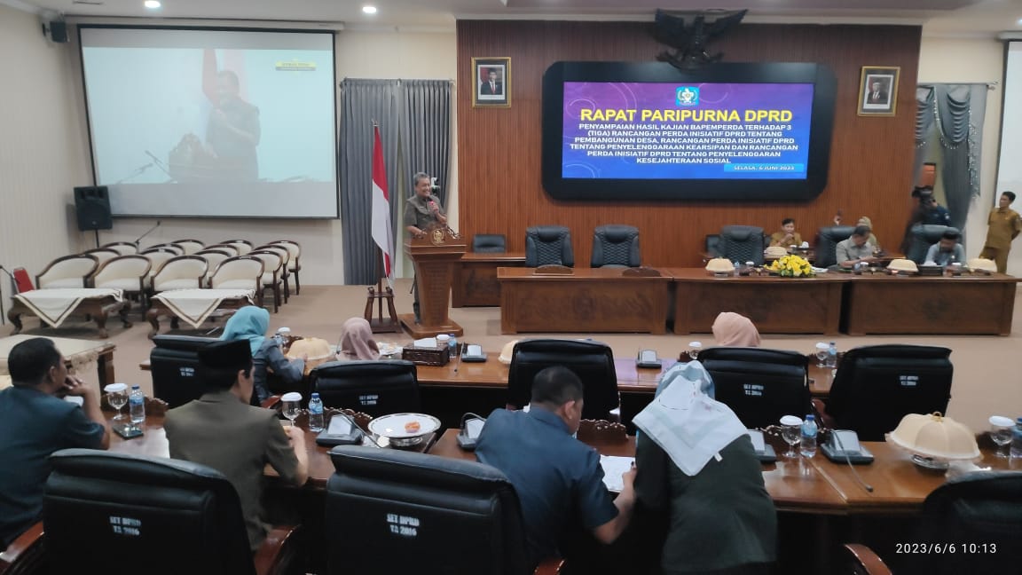 DPRD Kabupaten Soppeng melaksanakan Rapat Paripurna DPRD dengan agenda penyampaian hasil kajian Bapemperda terhadap tiga rancangan perda inisiatif DPRD yaitu rancangan perda tentang pembangunan desa, rancangan perda tentang penyelenggaraan kearsipan, dan rancangan perda tentang penyelenggaraan kesejahteraan sosial” pada hari selasa 6 juni 2023 pukul 09:00 Wita, yang dipimpin oleh A. Mapparemma (Wakil Ketua I DPRD) secara terbuka.
