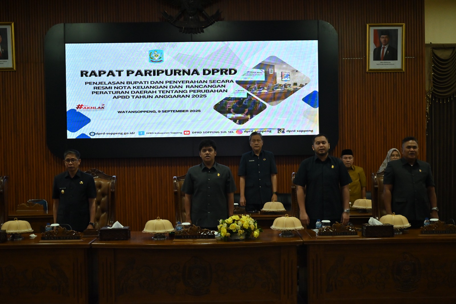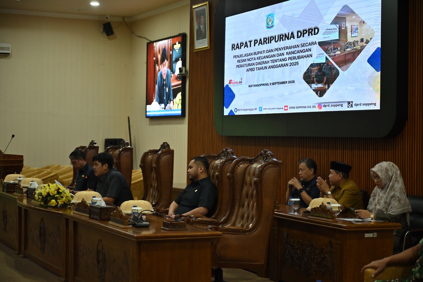 Soppeng, 9 September 2025 – DPRD Kabupaten Soppeng menggelar Rapat Paripurna Tingkat I dengan agenda penyerahan Nota Keuangan dan Rancangan Peraturan Daerah (Perda) tentang Perubahan APBD Tahun Anggaran 2025. Rapat dipimpin Ketua DPRD dan dihadiri Wakil Bupati Soppeng, Wakil Ketua DPRD, anggota DPRD, unsur Forkopimda, Ketua Pengadilan Negeri Watansoppeng, Ketua Pengadilan Agama Watansoppeng, Penjabat Sekretaris Daerah beserta jajaran pejabat eselon II dan III, para camat, serta seluruh hadirin.