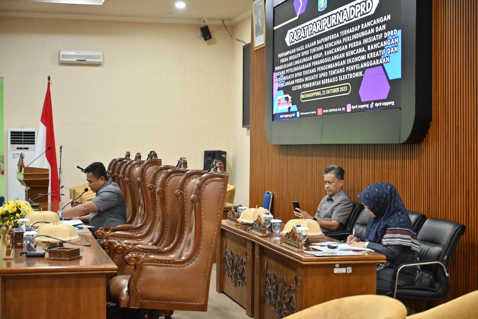 Watansoppeng, 22 Oktober 2025 — Dewan Perwakilan Rakyat Daerah (DPRD) Kabupaten Soppeng terus mendorong inovasi kebijakan daerah melalui pembentukan peraturan daerah inisiatif. Hal ini terwujud dalam Rapat Paripurna Penyampaian Hasil Kajian Badan Pembentukan Peraturan Daerah (Bapemperda) terhadap empat Rancangan Peraturan Daerah (Ranperda) inisiatif DPRD yang digelar di Ruang Rapat Paripurna DPRD.