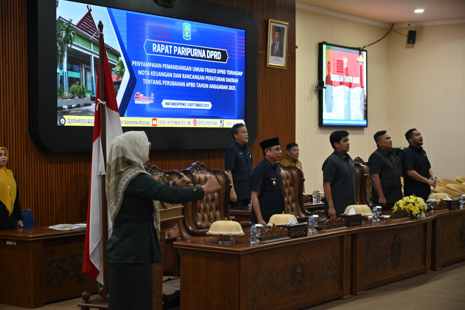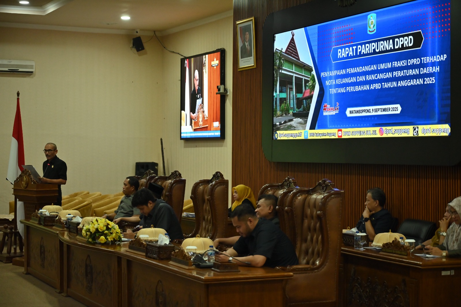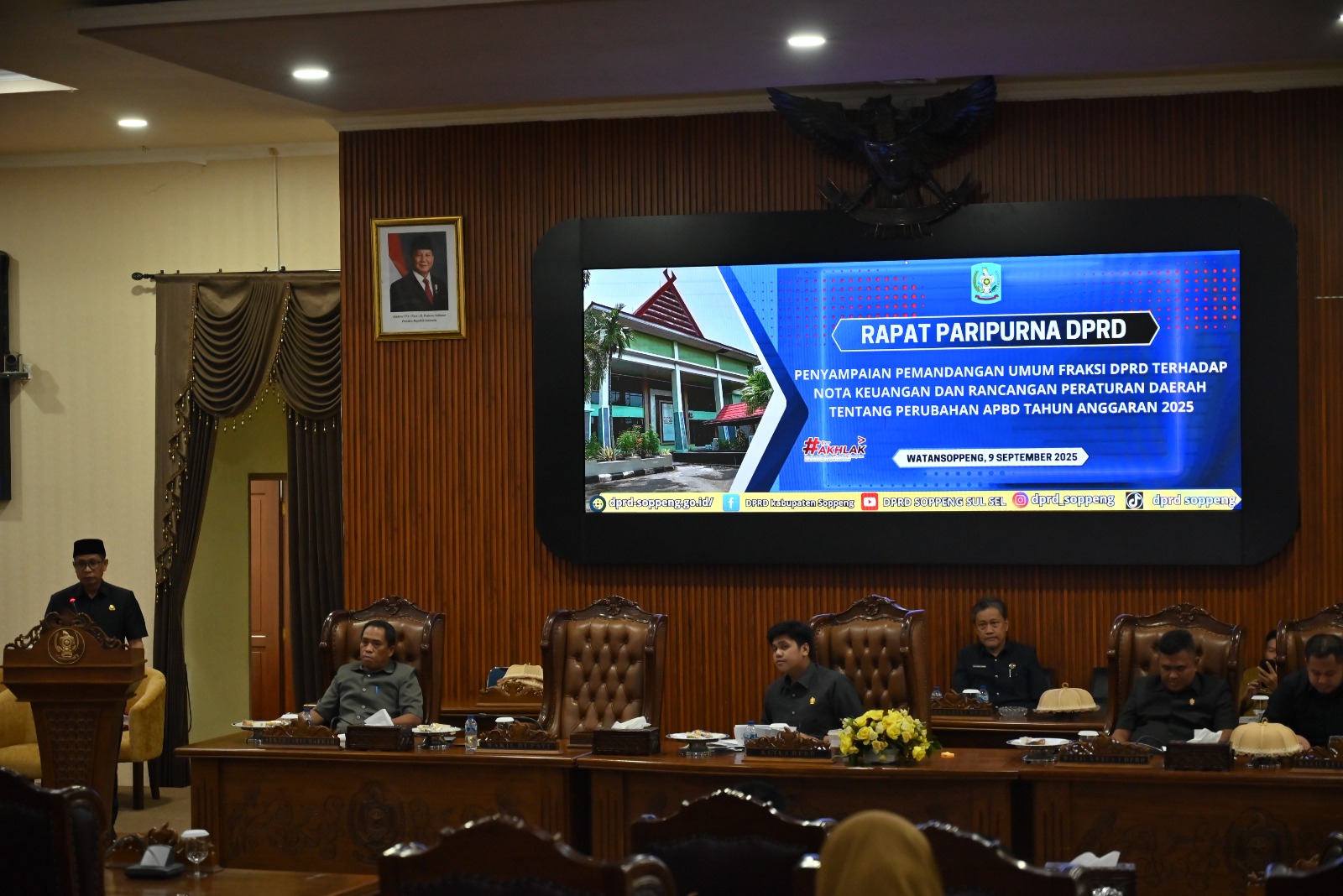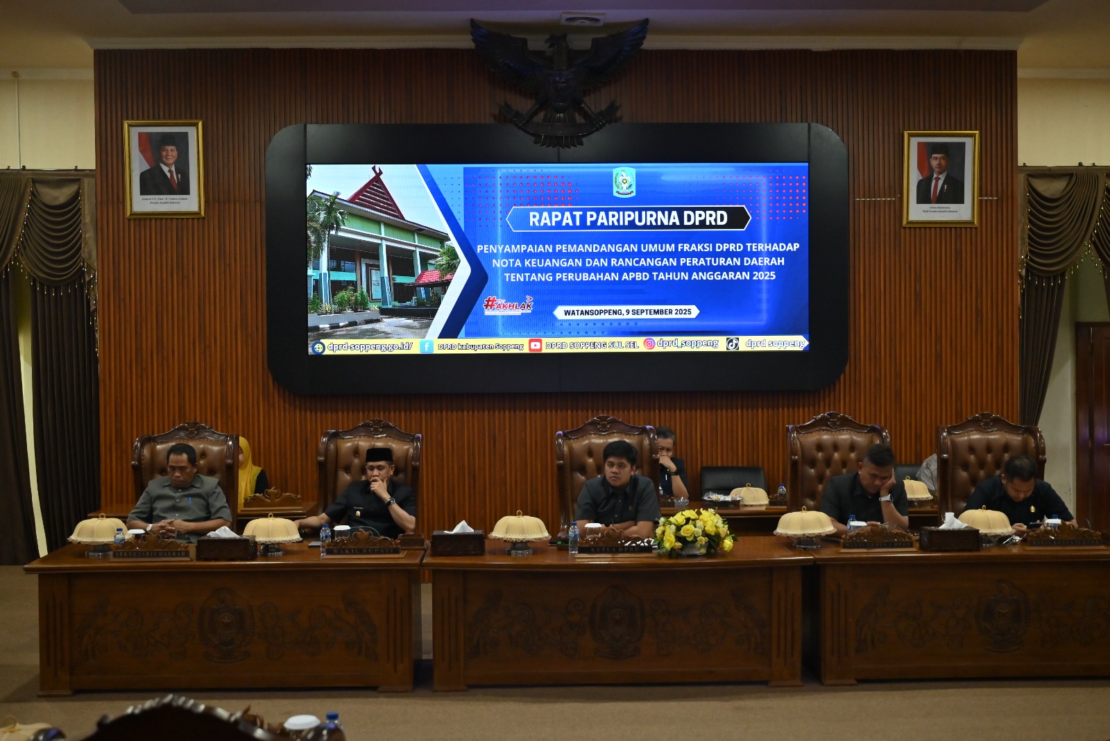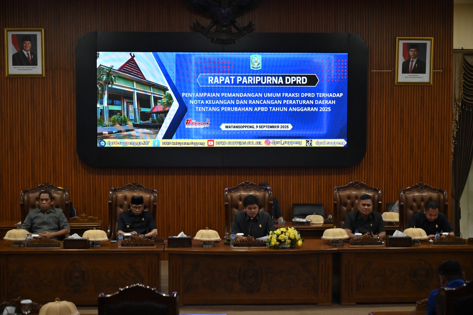 Soppeng, 9 September 2025 – Dewan Perwakilan Rakyat Daerah (DPRD) Kabupaten Soppeng menggelar Rapat Paripurna dengan agenda Penyampaian Pemandangan Umum Fraksi DPRD terhadap Rancangan Peraturan Daerah tentang Perubahan Anggaran Pendapatan dan Belanja Daerah (APBD) Tahun Anggaran 2025, serta Jawaban Bupati atas Pemandangan Umum Fraksi.