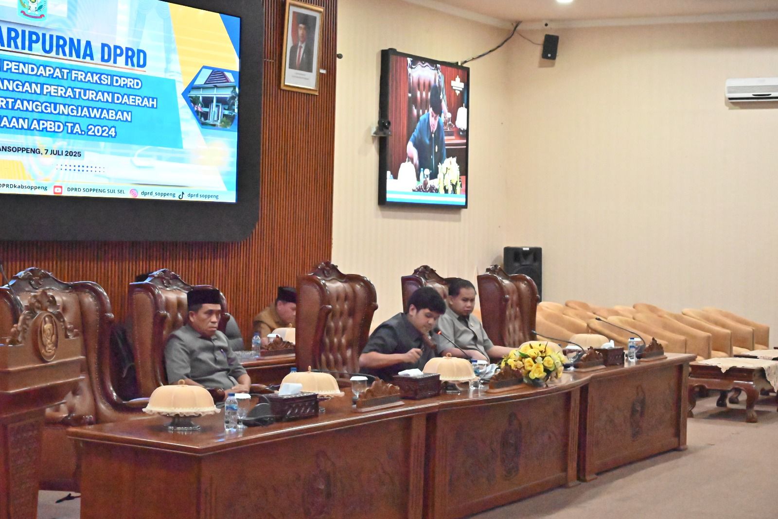 Watansoppeng, 7 Juli 2025 — DPRD Kabupaten Soppeng menggelar Rapat Paripurna Tingkat II dengan agenda pengambilan keputusan terhadap Rancangan Peraturan Daerah (Ranperda) tentang Pertanggungjawaban Pelaksanaan APBD Tahun Anggaran 2024. Rapat ini dipimpin langsung oleh Ketua DPRD, H. Andi Muhammad Farid, S.Sos., didampingi Wakil Ketua I H. Nasfiding dan Wakil Ketua II Muhammad Taufan, serta dihadiri 26 dari 27 anggota DPRD, Bupati Soppeng, Forkopimda, jajaran pejabat eselon II dan III, serta tamu undangan lainnya. Kuorum terpenuhi, sehingga rapat dinyatakan sah dan terbuka untuk umum.