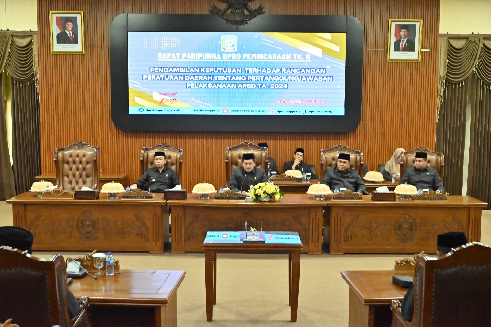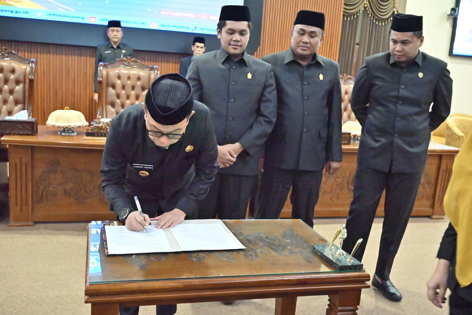 Ketua DPRD kemudian memimpin pengambilan keputusan, yang disetujui secara aklamasi oleh seluruh anggota dewan. Prosesi dilanjutkan dengan penandatanganan berita acara persetujuan bersama oleh Ketua DPRD, Wakil Ketua DPRD, dan Bupati Soppeng, sebagai simbol pengesahan Ranperda. Dokumen hasil keputusan DPRD secara resmi diserahkan kepada pihak eksekutif untuk ditindaklanjuti dalam mekanisme pemerintahan berikutnya.