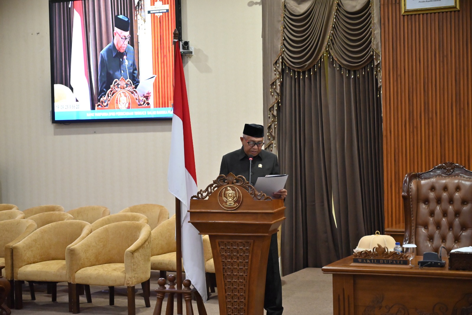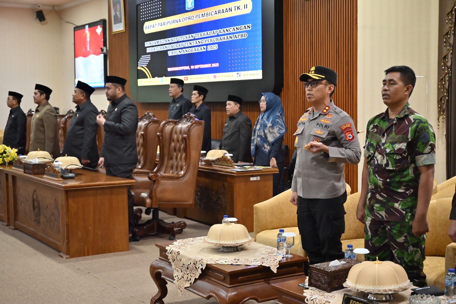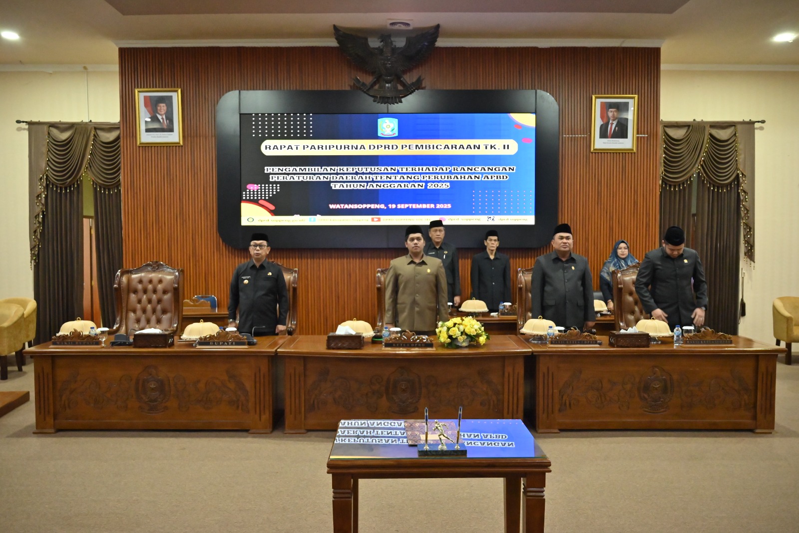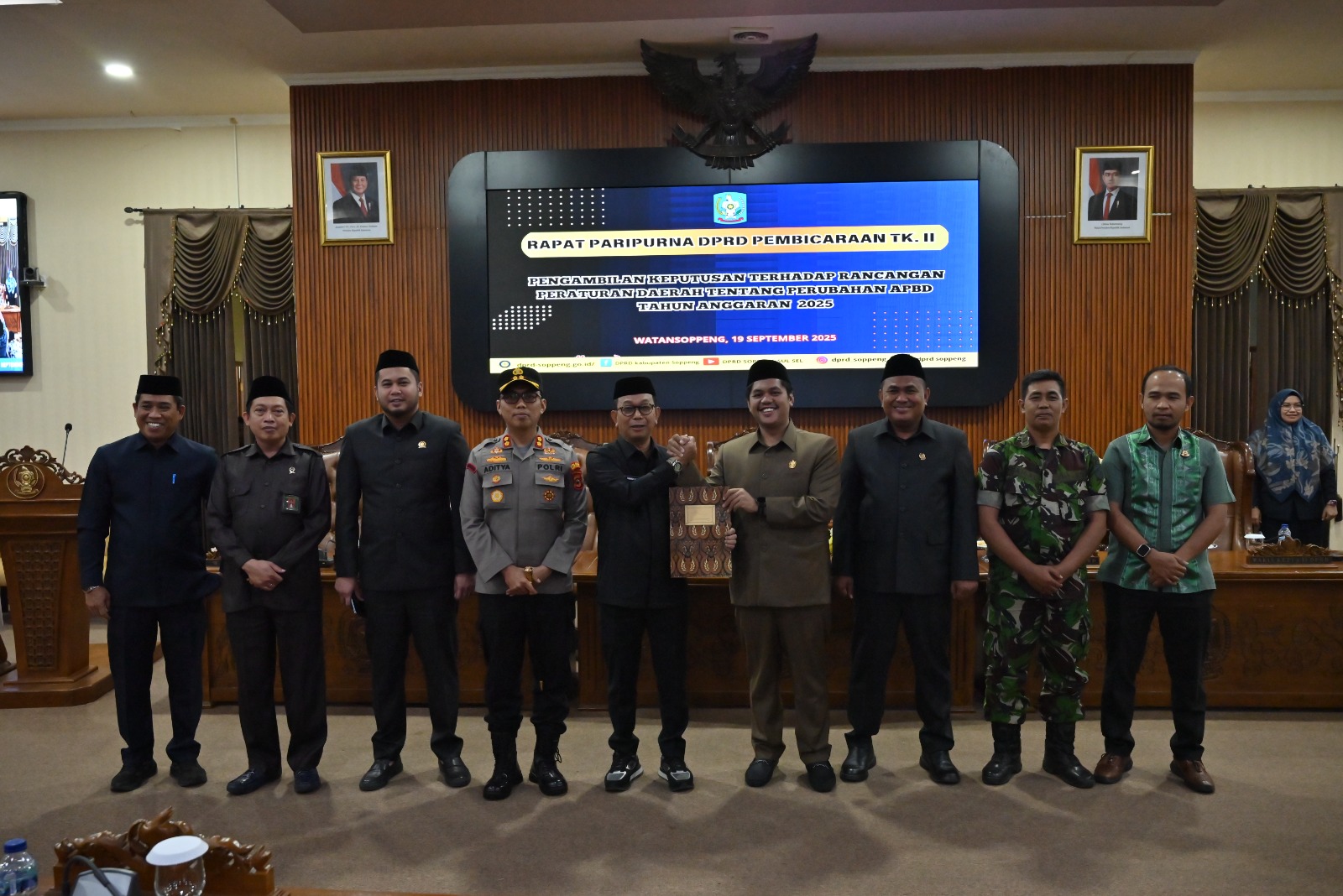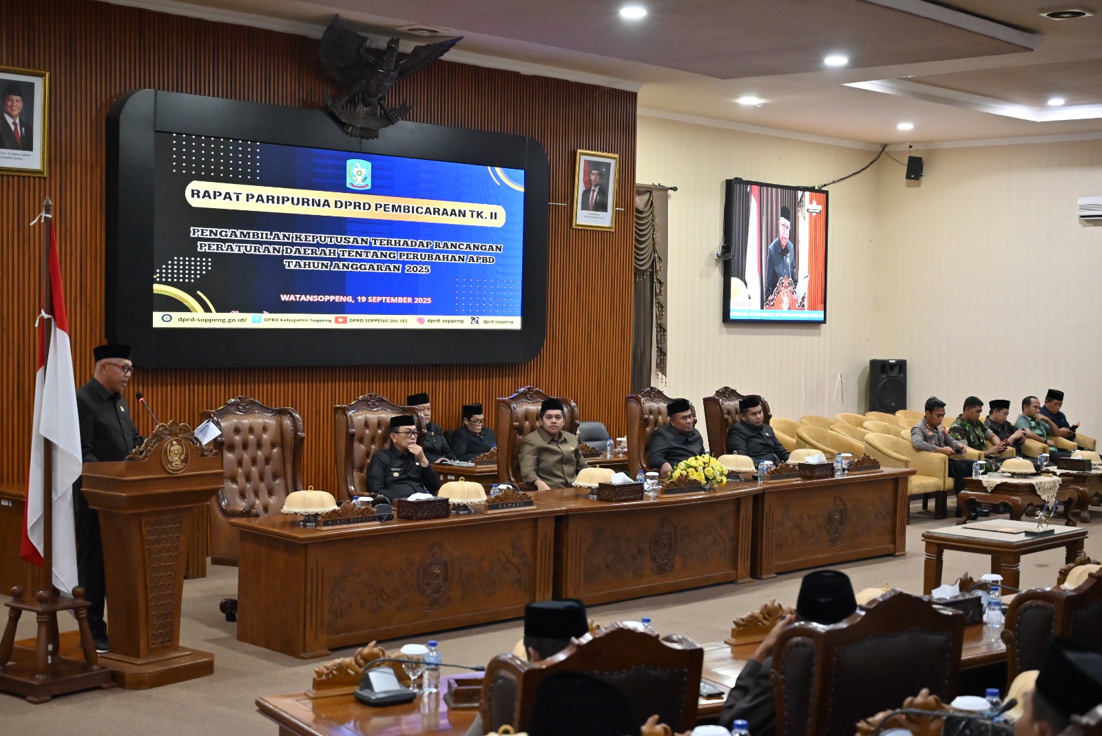 Watansoppeng, 19 September 2025 – DPRD Kabupaten Soppeng menggelar Rapat Paripurna Tingkat II dengan agenda Pengambilan Keputusan terhadap Rancangan Peraturan Daerah tentang Perubahan APBD Tahun Anggaran 2025. Rapat dipimpin langsung oleh Ketua DPRD, H. Andi Muhammad Farid, S.Sos, dengan dihadiri Bupati Soppeng Suwardi Haseng, Wakil Bupati, Forkopimda, pejabat lingkup Pemerintah Kabupaten, serta anggota DPRD.