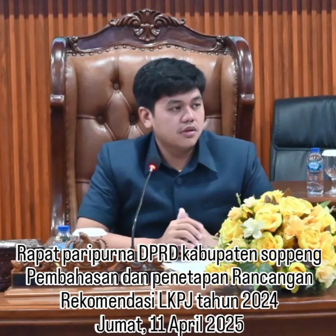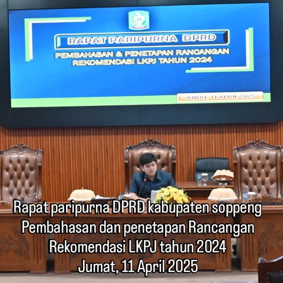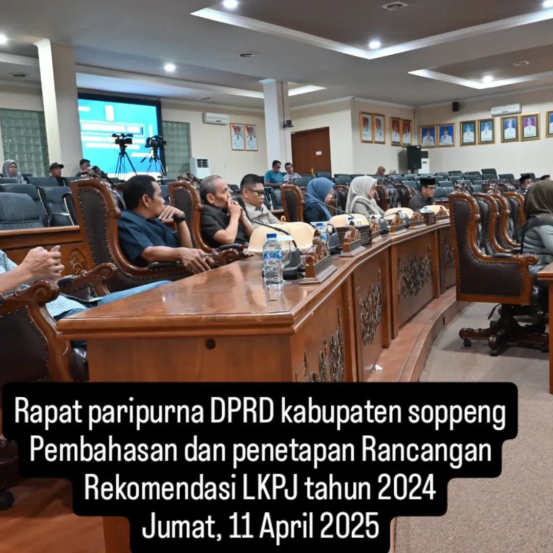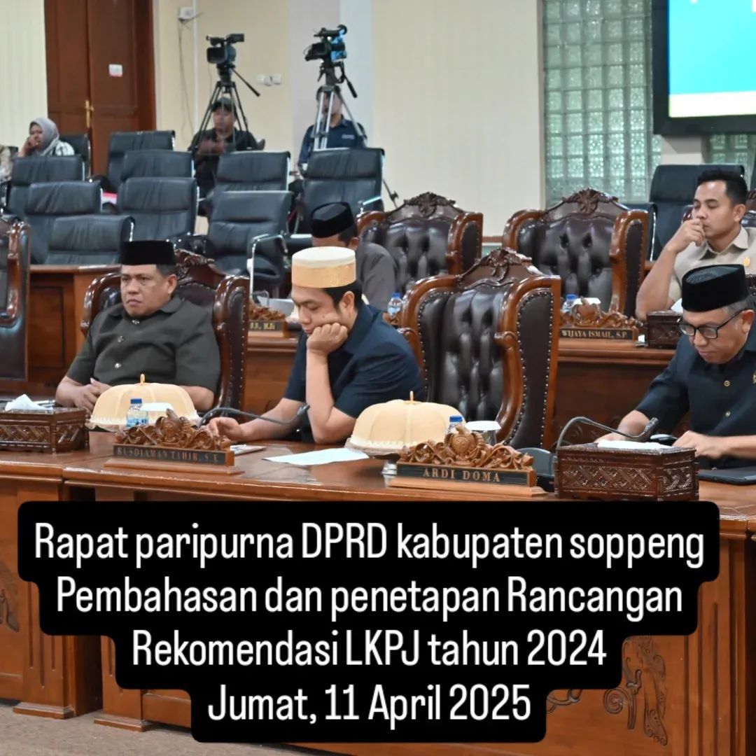 Watansoppeng, 11 April 2025 — DPRD Kabupaten Soppeng menggelar Rapat Paripurna dengan agenda Pembahasan dan Penetapan Rancangan Rekomendasi Laporan Keterangan Pertanggungjawaban (LKPJ) Kepala Daerah Tahun 2024, bertempat di Ruang Rapat Paripurna DPRD Soppeng, Jumat (11/04/2025).